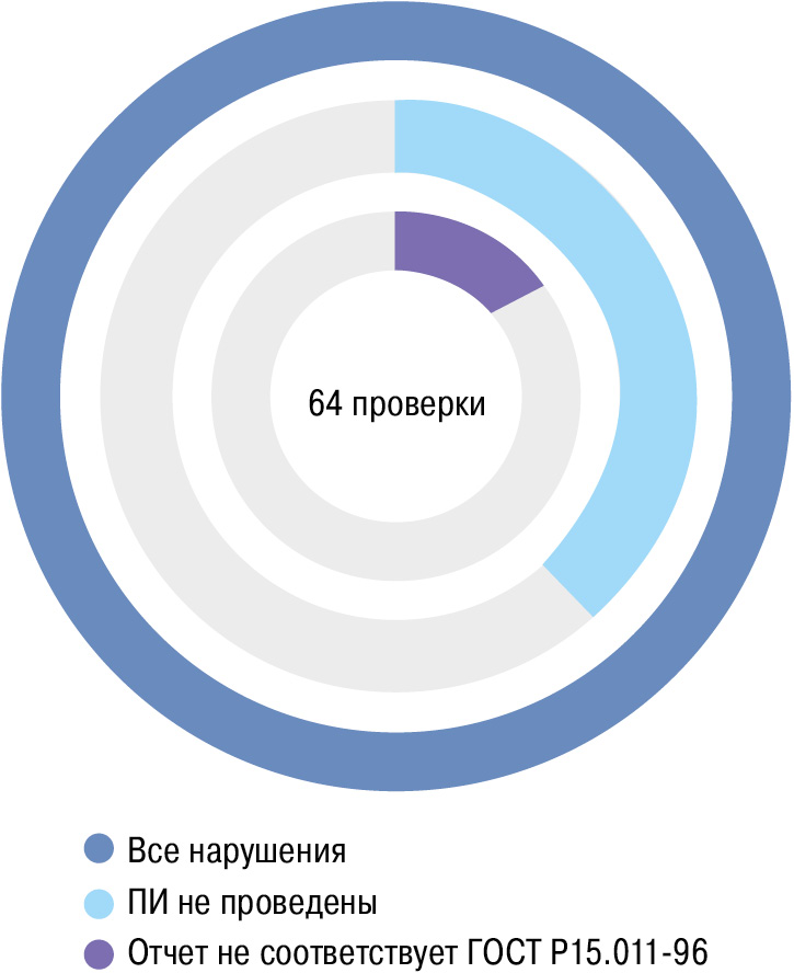 - в результате проверок организаций — исполнителей работ гражданского назначения: ПИ не проведены — девять организаций-исполнителей, отчеты о ПИ не соответствуют ГОСТ Р 15.011-96 — четыре организации-исполнителя.