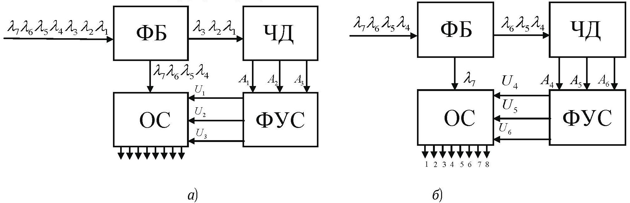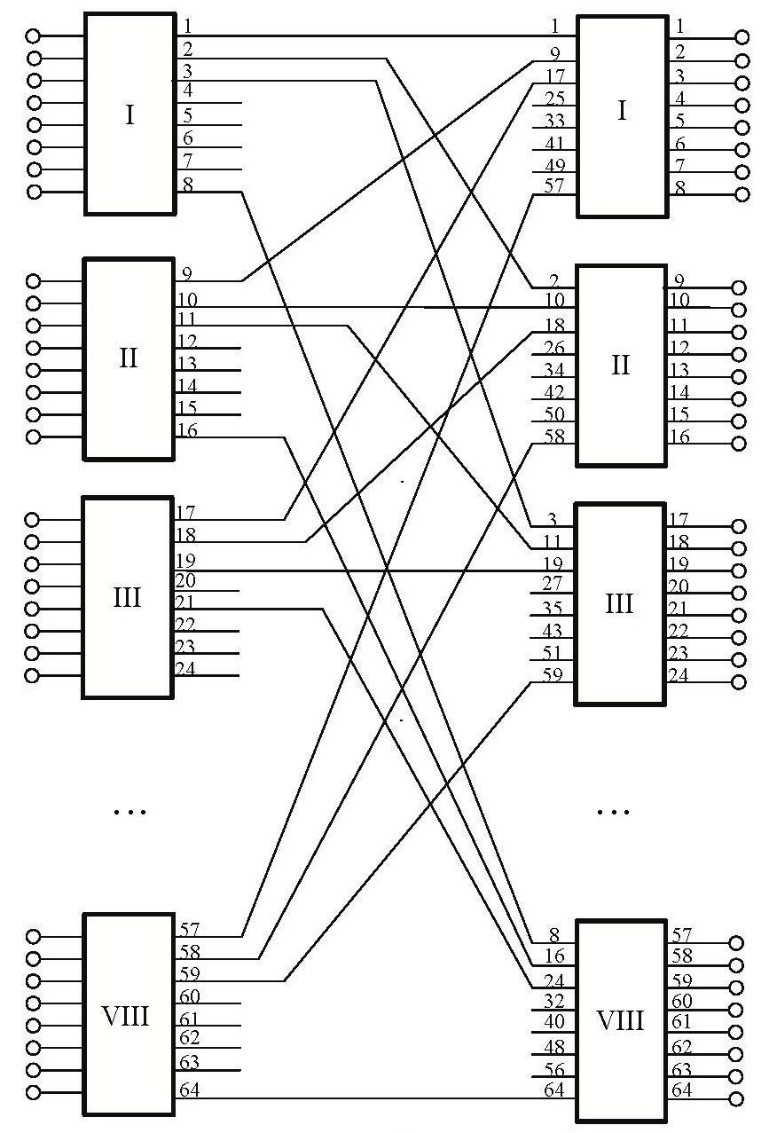 Составная коммутационная система 64×64 состоит из двух звеньев, каждое из которых содержит 8 оригинальных элементарных коммутационных устройств 8×8, схема соединения которых приведена на рис. 1. Каждый из 64-х выходов составного коммутатора однозначно определяется шестибитным числом (от 000000 до 111111) и кодируется комбинацией управляющих оптических сигналов, поступающих на длинах волн . При этом амплитуда каждого из шести соответствующих им электрических сигналов после оптоэлектрического преобразования может принимать одно из двух значений или (), первое из которых соответствует логическому нулю, а второе — единице.