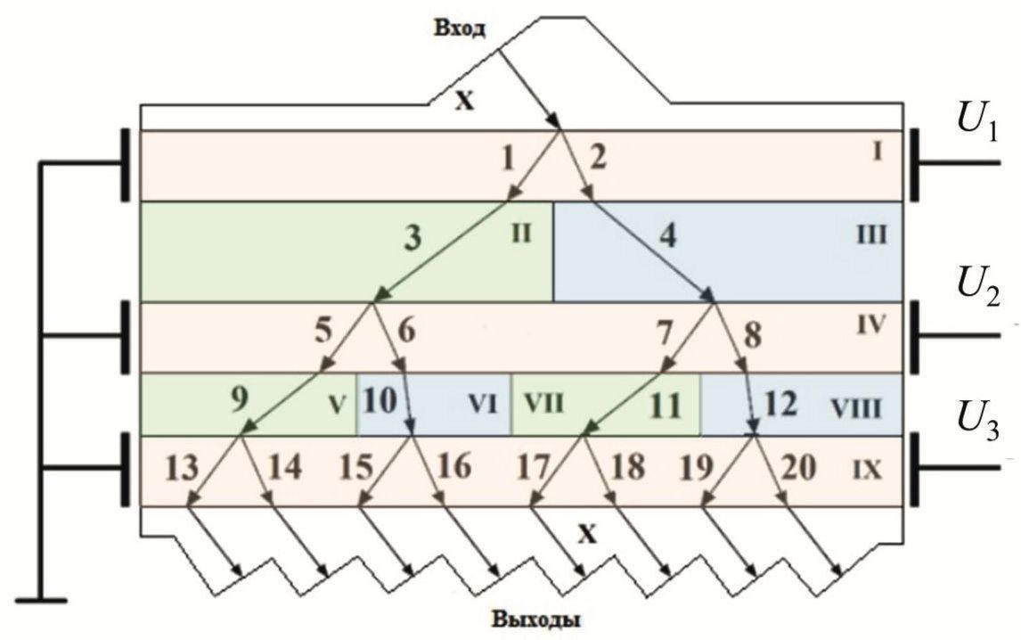 Особенностью ее является отсутствие механических отклоняющих элементов, вместо чего используется электрооптическое управление трассой прохождения оптических сигналов (маршрутизация). Это происходит за счет подачи на управляющие (электрические) входы отклоняющей системы, размещенные в слоях I, IV, IX соответствующего напряжения. Отклоняющая система представляет собой многослойную структуру (рис. 3): I, IV, IX — слои ниобата лития, в которых осуществляется управление, III, VI, VIII — слои обычного диэлектрика, II, V, VII — слои оптического метаматериала с особыми свойствами [11]. Для пространственного управления траекторией распространения лучей используется эффект «отрицательного преломления» в резонансной области анизотропного материала [12]. Для большего пространственного разнесения в структуре использованы слои метаматериала с отрицательным углом преломления [13].