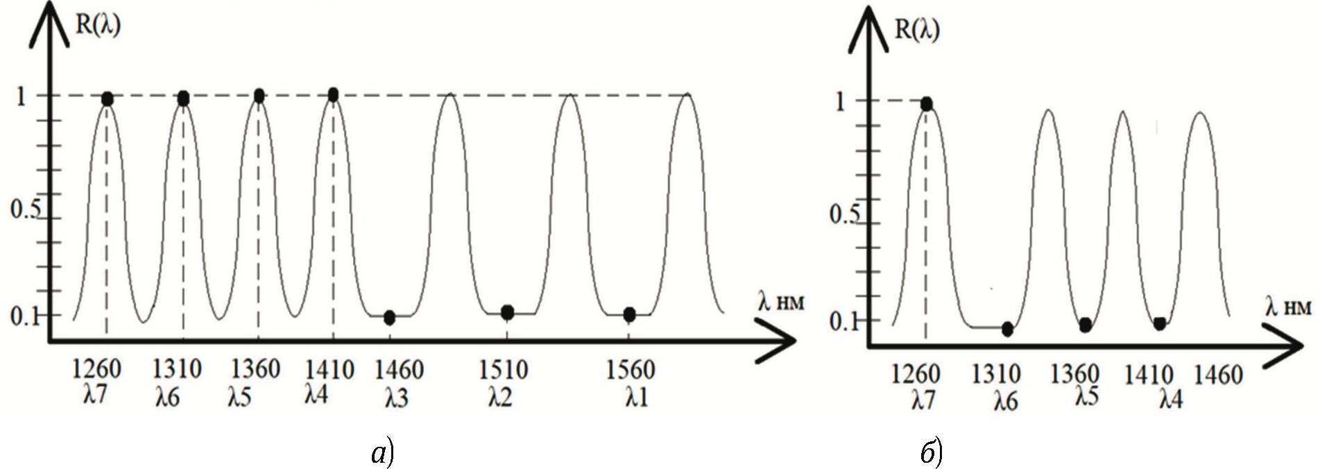 Задача заключается в том, чтобы обеспечить прохождение света на одних длинах волн и отражение — на других. В пределах диапазона прозрачности оптоволокна 1235÷1585 нм необходимо выбрать семь равномерно распределенных длин волн и подобрать параметры фильтров Брэгга для первого и второго звеньев таким образом, чтобы одни длины волн отражались с коэффициентом, близким к 100%, а другие с высокой эффективностью проходили (рис. 5).