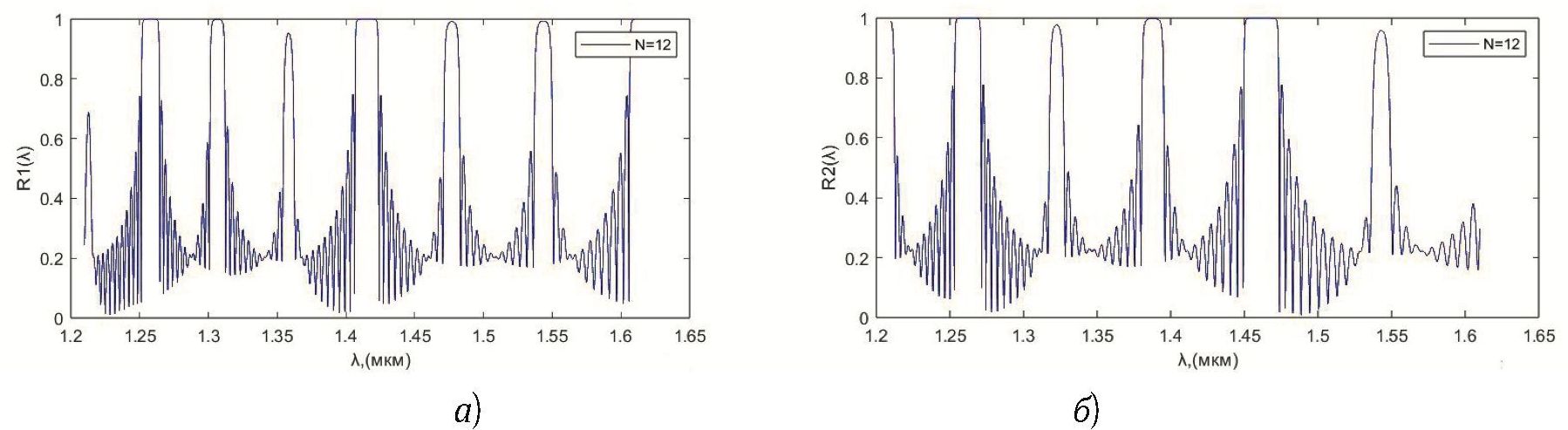 Рис. 6. Коэффициенты отражения фильтров Брэгга 1-го (а) и 2-го (б) звеньев.