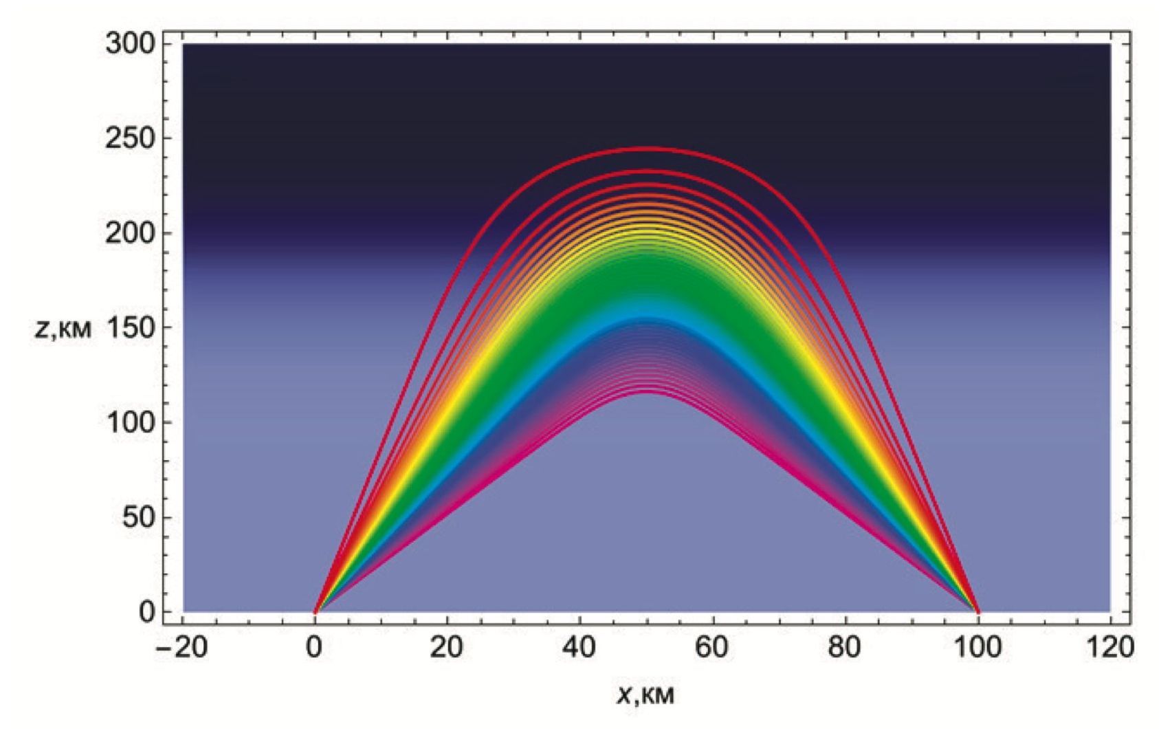 На рисунке приведены только те лучи, которые попали из излучателя в приёмник, расположенный справа на расстоянии 100 км. В построении рисунка участвовало 45 лучей. Нижний фиолетовый луч соответствует частоте 1 МГц; верхний красный луч — частоте 6.993 МГц.