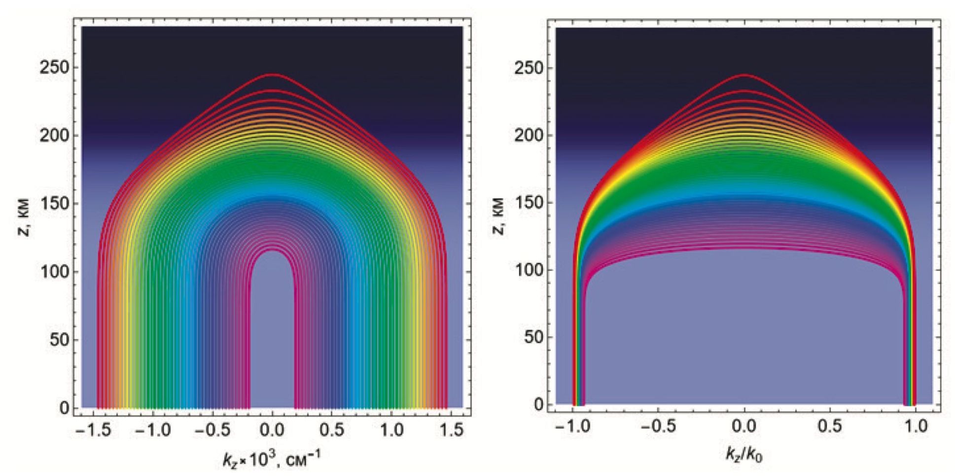 На рис. 3 показаны зависимости волнового вектора в абсолютных (рис. 3(а)) и относительных (рис. 3(б)) единицах от высоты. На рис. 3(а) кривые образуют аркаду, так как начальное значение компоненты волнового вектора уменьшается с уменьшением частоты.