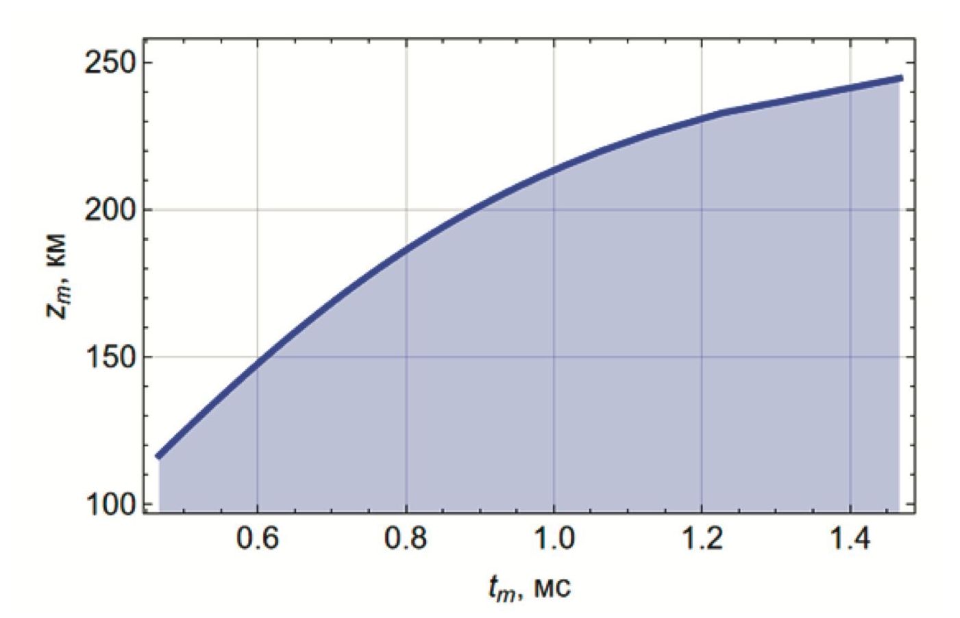 Точка отражения радиоволны от ионосферы (zm) определяется из условия: . Анализируя решения бихарактеристической системы, нетрудно найти зависимость высоты отражения луча zm от ионосферного слоя как функцию времени прихода луча в точку отражения tm: zm = z(tm). Эта зависимость показана на рис. 6.