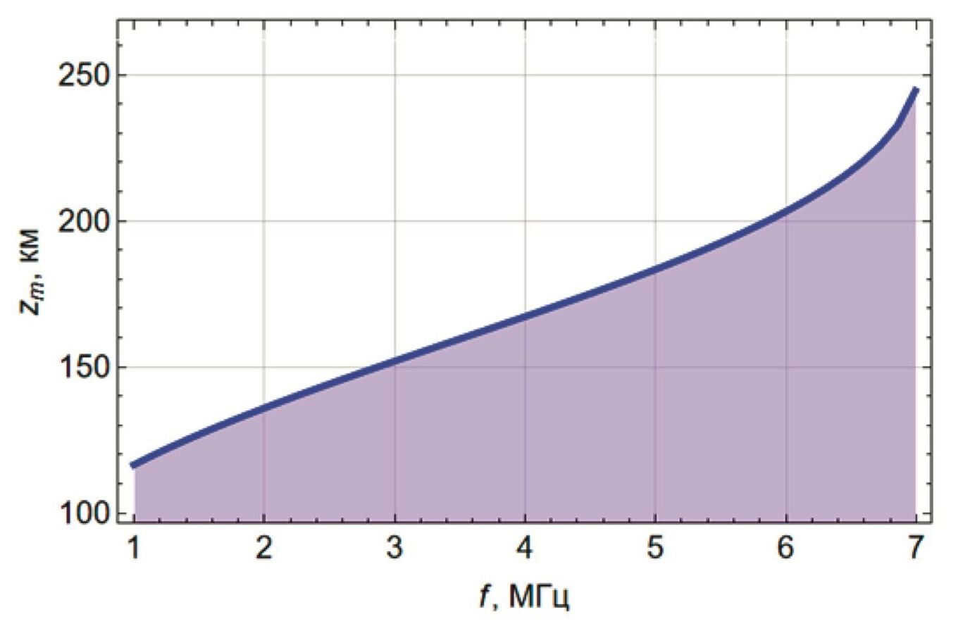Для каждого луча, показанного на рис. 1, существует своя частота и своя точка отражения. Их можно связать функциональной зависимостью, представленной на рис. 7. Высота отражения плавно растет с частотой: сначала медленно, а после точки перегиба всё быстрее при приближении к максимуму ионосферного слоя.
