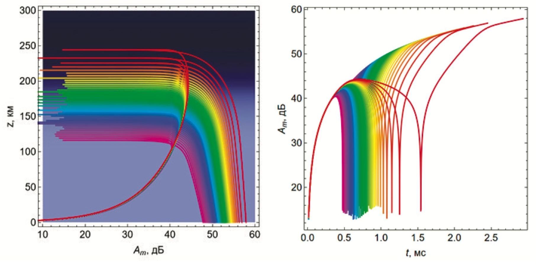 На рис. 9 показано вычисленное по этой формуле ослабление сигнала за счет расходимости. Рис. 9(а) — это зависимость ослабления от высоты, а рис. 9(б) — это зависимость ослабления от времени вдоль лучей.