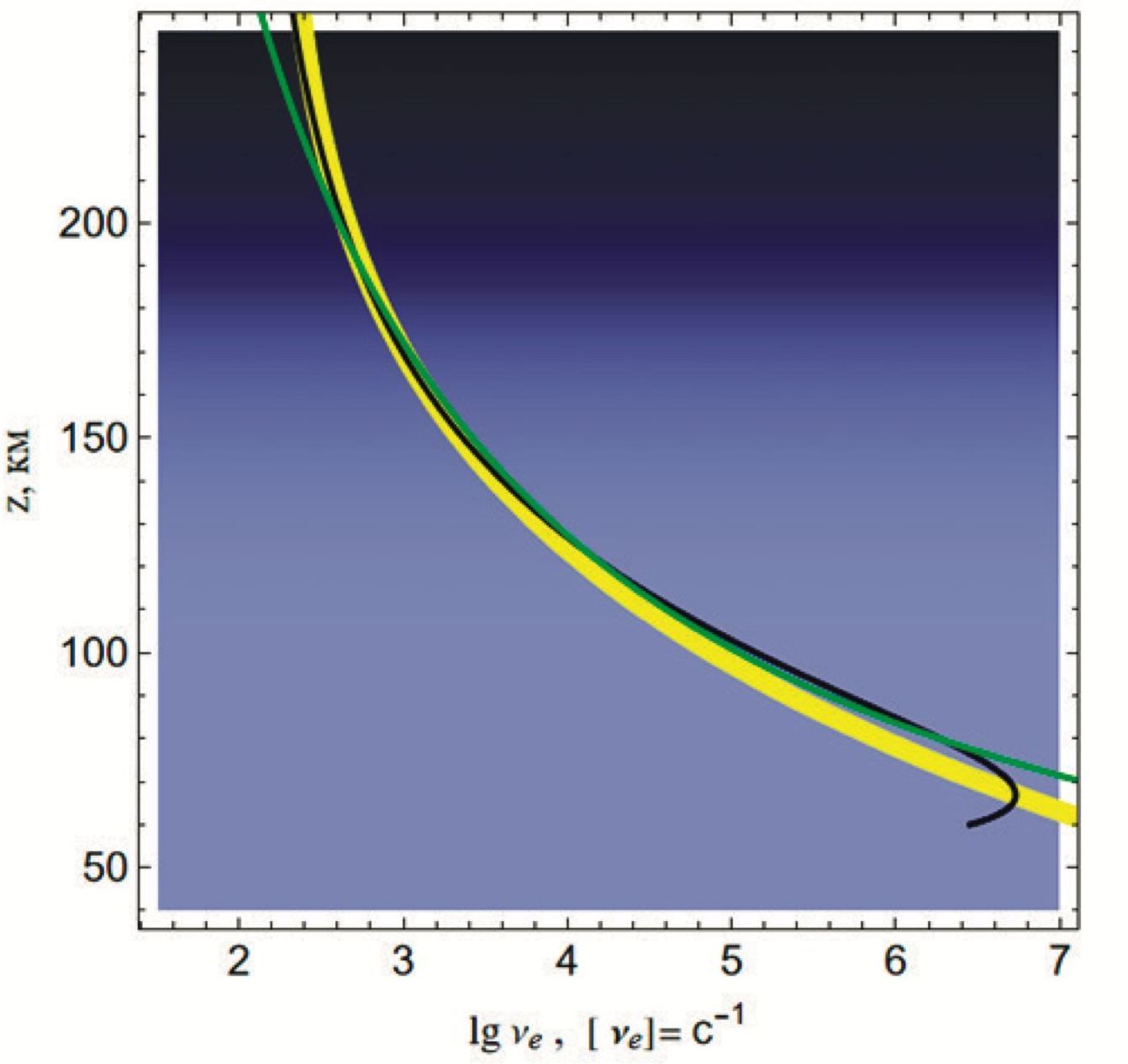 в котором высота z выражена в километрах. На рис. 11 показана функциональная зависимость десятичного логарифма эффективной частоты соударений (lgve) от высоты: