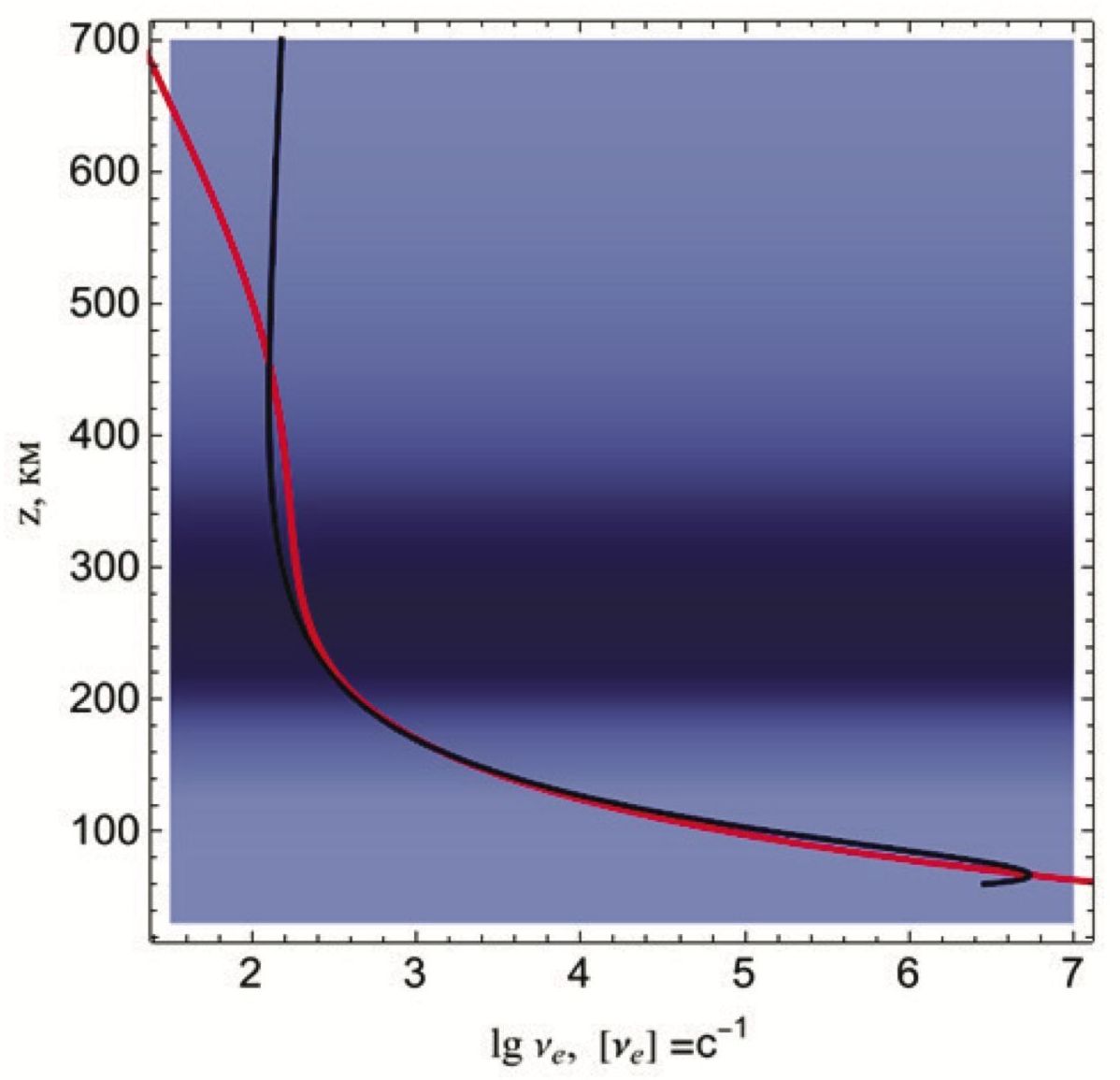 На рис. 16 выполнено сопоставление исходной эффективной частоты соударений (красная линия) и аппроксимации, полученной по формуле (28) (черная линия). Из рис. 16 следует, что аппроксимационная формула неплохо работает даже при больших высотах (до 450 км). Существенные отличия возникают на высотах за пределами главного максимума ионосферного слоя.