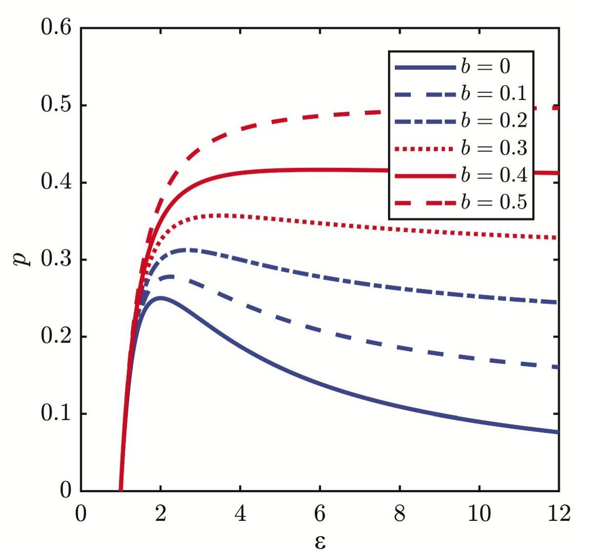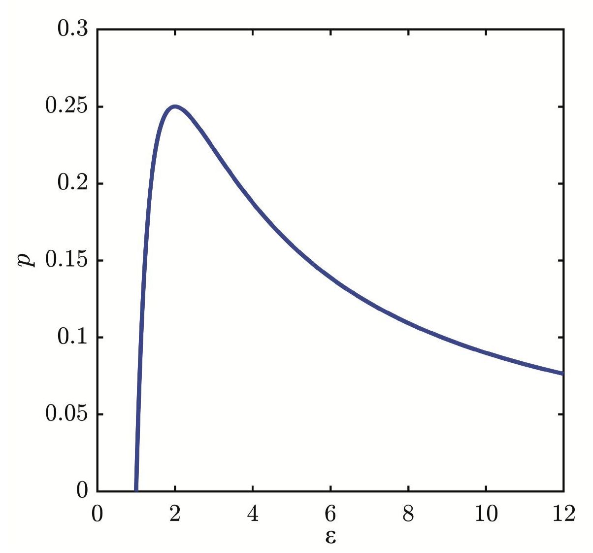 Для анализа полученных формул, построим график зависимости упругооптической постоянной p неполярных газов от диэлектрической проницаемости по формуле (13). Как видно из рис. 1, эта зависимость имеет один ярко выраженный максимум.