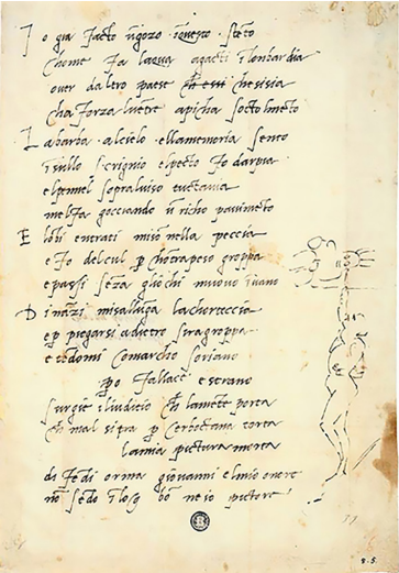 Следует отметить, что эксперименты с формой сонета в итальянской культуре эпохи Возрождения были связаны, главным образом, со схемой рифмовки и наличием коды [Bausi, 1993]. Микеланджело, по-видимому, первый поэт, который сознательно исказил классическую структуру, отображая тем самым деформацию физического тела и задваивание образа лирического субъекта, причем для прояснения своего замысла он обратился к иллюстрации.