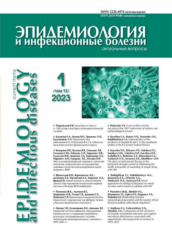 Results. The incidence of acute HB and HC (AHB and AHC) in the FEFD in 2020 turned out to be twice less than the average Russian values: 0.15 cases of AHB and 0.39 cases of AHC per 100,000 population, while it in the Russian Federation was an average of 0.35 and 0.66 per 100,000 population, respectively. The trend in the incidence of AHC was shown to be correlated with a decrease in the incidence of drug addiction in the FEFD. The overall incidence of chronic HB in the FEFD was slightly higher than that detected in the Russian Federation (5.06 versus 4.36 per 100,000 population). There were no significant differences between the incidence rates of CHC in the FEFD and in the Russian Federation: the rates were 16.82 and 16.70 per 100,000 population, respectively. A reduction in the incidence of HB and HC in 2020 was noted in both the FEFD and in the whole of the Russian Federation.