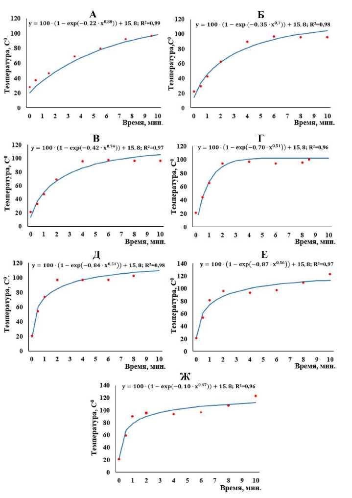Рис. 1. Зависимость температуры нагрева торфа от мощности СВЧ-излучения и продолжительности облучения (А – мощность 100 Вт, Б – мощность 200 Вт, В – мощность 300 Вт, Г – мощность 450 Вт, Д – мощность 600 Вт, Е – мощность 700 Вт, Ж – мощность 800 Вт)