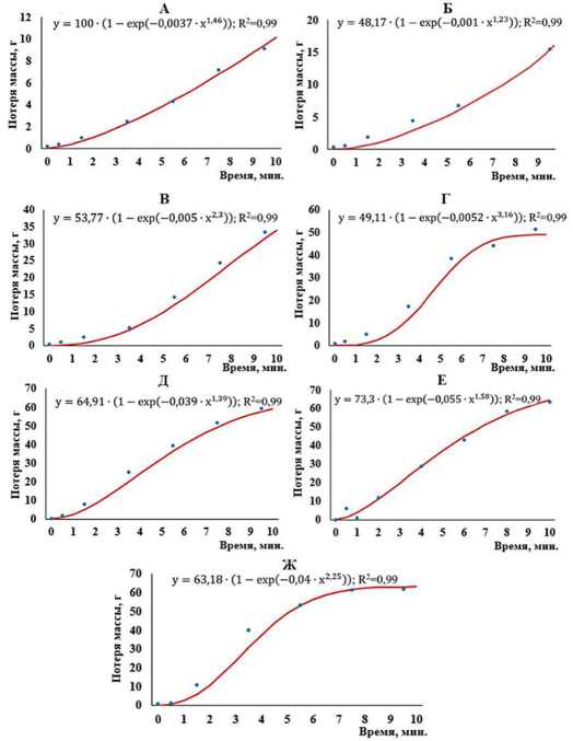 Рис. 2. Зависимость потери массы торфа от мощности излучения и продолжительности обработки (А – мощность 100 Вт, Б – мощность 200 Вт, В – мощность 300 Вт, Г – мощность 450 Вт, Д – мощность 600 Вт, Е – мощность 700 Вт, Ж – мощность 800 Вт)