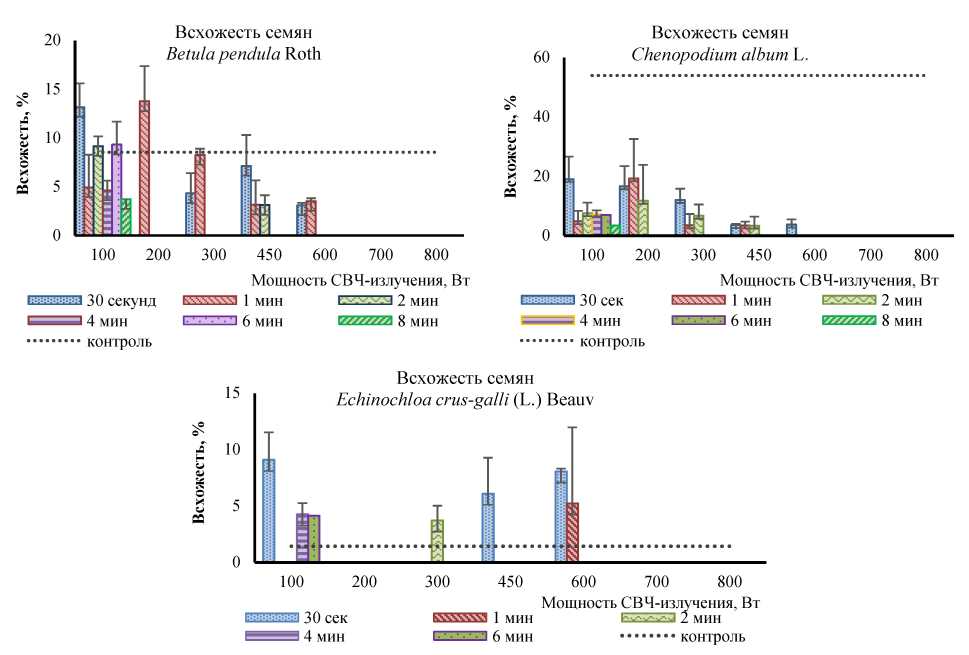 Всхожесть семян Chenopodium album L. составила 54 %. Ингибирующее действие исследуемых режимов ЭМИ СВЧ относительно контрольной группы наблюдалось у мари белой. Полное отсутствие всходов отмечалось при мощности излучения в диапазоне 200–450 Вт и продолжительности воздействия СВЧ от 4–8 минут, а также при 600 Вт (1–8 минут), 700 и 800 Вт. Для семян берёзы повислой были отмечены режимы, стимулирующие прорастание семян: при мощности 100 Вт и временно́й экспозиции 30 сек., 2 мин., 6 мин.; при 200 Вт – 1 мин.; при 700 Вт – 30 сек., 1 мин.; 800 Вт – 30 сек. Потеря всхожести семян берёзы наблюдалась при мощности СВЧ-излучения 300; 600; 700; 800 Вт, начиная с двух минут воздействия. Режимы обработки мощностью 100 Вт (30 сек., 4–6 мин.), 300 Вт (2 мин.), 450 Вт (30 сек.), 600 Вт (30–60 сек.) повышали естественную всхожесть семян ежовника обыкновенного. В остальных режимах прорастание семян не наблюдалось. Анализ стимулирующих режимов СВЧ-обработки для семян сорных растений выявил эффективные температуры для прорастания семян берёзы и ежовника, они находились в диапазоне 28–80 °С. Таким образом, минимальным эффективным режимом СВЧ-облучения также можно считать 300 Вт при десятиминутной экспозиции.