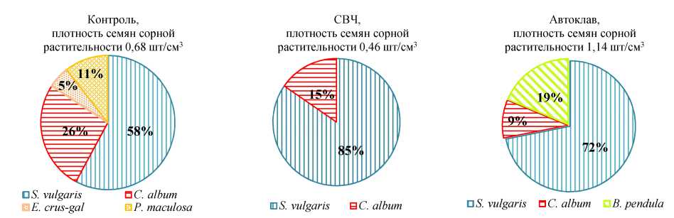 Видовой состав прорастающих семян сорной растительности после обеззараживания СВЧ-излучением сократился до S. vulgaris (85 %) и C. album (15 %). Автоклавирование стимулировало ростовые процессы семян B. pendula (19 %), ранее не прораставших в контрольных образцах. Семена S. vulgaris (72 %) и C. album (9 %) также давали жизнеспособные всходы. Таким образом, применение СВЧ-излучения эффективно снижает плотность жизнеспособных семян сорной растительности в торфе.