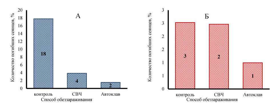 Рис. 6. Количество сеянцев, погибших от инфекционных заболеваний: А – P. sylvestri, Б – P. abies