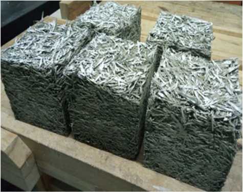 Далее полученную смесь укладывали в металлические формы-кубы с длиной грани 150 мм. Для более однородного распределения смеси полученный состав укладывали послойно, высотой не более 5 см, с последующим уплотнением путём трамбования. Заполненные формы выдерживали в течение суток, после чего производили распалубку.