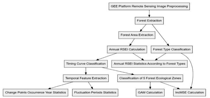 Through the combined use of GAM and RF models, this study comprehensively explores the relationship between RSEI and environmental factors, deepening the understanding of changes in forest ecosystems. We classified linearly stable time series as the RSEI stable zone, logarithmic increasing and logistic increasing as the high RSEI stable zone, logarithmic decreasing and logistic decreasing as the low RSEI stable zone, linearly decreasing as the RSEI decreasing zone, and exponential increasing and linearly increasing as the RSEI increasing zone. We employed the GAM to explore the impact of altitude on annual mean RSEI, aiming to reveal the complex relationship between altitude and RSEI within different ecological zones. By introducing altitude as a key explanatory variable and the annual mean RSEI as the response variable, we constructed models for five ecological zones. The model uses a Gaussian link function to accommodate the continuous nature of RSEI and fully capture its nonlinear relationship with altitude. GAM reveals the nonlinear relationships and key turning points between environmental factors and RSEI, while the RF model and IncMSE analysis pinpoint which environmental factors are most crucial to RSEI changes, providing a scientific basis for forest ecology protection and management. This integrated methodology not only enhances insights into the forest ecosystem's response to environmental changes but also offers practical tools for devising effective conservation strategies and management measures.