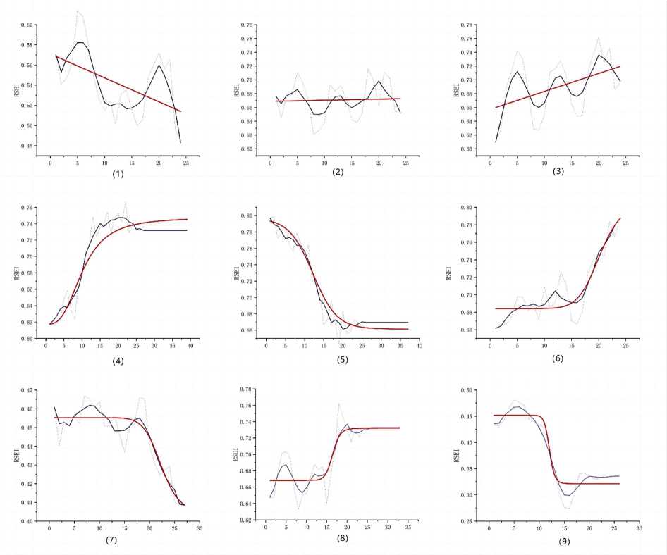 Furthermore, the analysis categorizes the overall direction of RSEI changes – increasing or decreasing – based on the slope of the time series, with a threshold of 0,05 set to define a linearly stable state. This methodology delineates nine distinct time-series fitting models: linear decreasing, linear increasing, linear stable, exponential increasing, exponential decreasing, logarithmic decreasing, logarithmic increasing, logistic decreasing, and logistic increasing (Fig. 3). Through this sophisticated modeling approach, the study meticulously simulates the temporal dynamics of forest ecosystems, providing a refined understanding of ecological trends over the observed period.