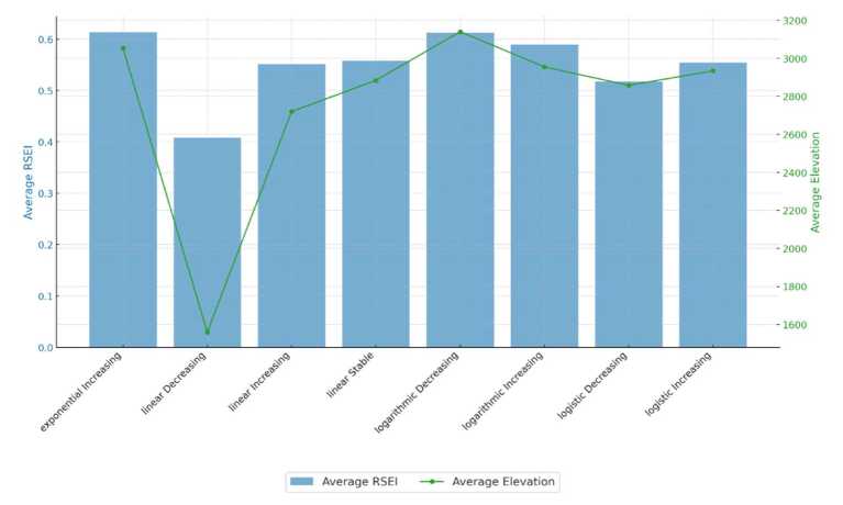 According to Fig. 4, the Exponential increasing category demonstrated the highest average RSEI values at 0,613, with an average forest altitude of 3,054 meters. Other time-series curve types also showed similar trends, indicating a strong correlation between high RSEI values and high altitudes. Forests in high-altitude areas are generally less disturbed by human activities, likely harbouring more pristine and intact ecosystems, which contributes to maintaining high environmental quality.