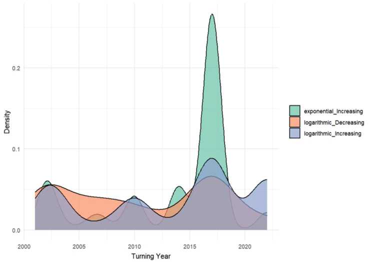 Fig. 6. Density statistics chart of exponential increasing, logarithmic increasing, and logarithmic decreasing change points occurrence years