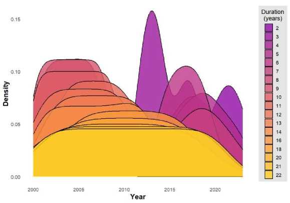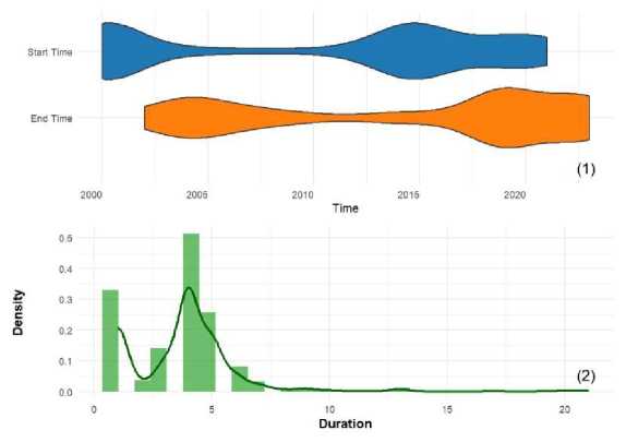 Similarly, the change points for logistic curves, which depict periods of fluctuation from stability back to stability, were extracted. As shown in Fig. 7, fluctuating periods are present throughout the entire study period, but the specific times of fluctuations and their durations vary. The start times are primarily clustered around 2001 and 2014, while the end times concentrate around 2004 and 2018. In 2013, the most common duration of fluctuation was 4 years, with fluctuation periods mainly ranging from 1 to 5 years.