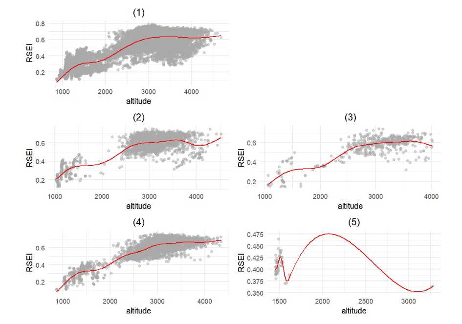 Fig. 9. Altitude’s influence curve in different zone: (1) RSEI Stable Zone; (2) High RSEI Stable Zone; (3) Low RSEI Stable Zone; (4) RSEI Decreasing Zone; (5) RSEI Increasing Zone