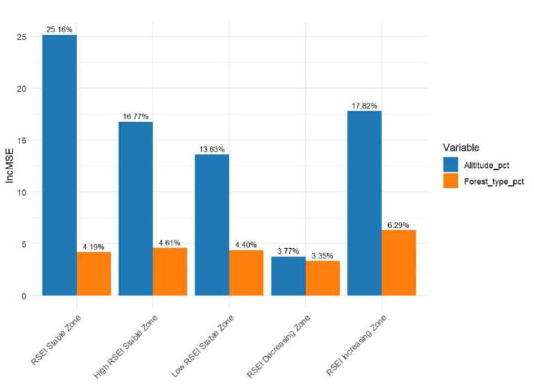 In-depth analysis using the RF model across different ecological zones identified altitude as a universally important predictor, particularly in the RSEI stable and RSEI increasing zones, as evidenced by the Incremental Mean Square Error (IncMSE) values of altitude changes (Fig. 10). Especially in the RSEI stable and RSEI increasing zones, higher IncMSE values underscore the significant role of altitude variations on forest RSEI, indicating that forest ecological quality in these areas may improve with increasing altitude. Concurrently, there was a notable decrease in the IncMSE value of altitude within the RSEI decreasing zone.