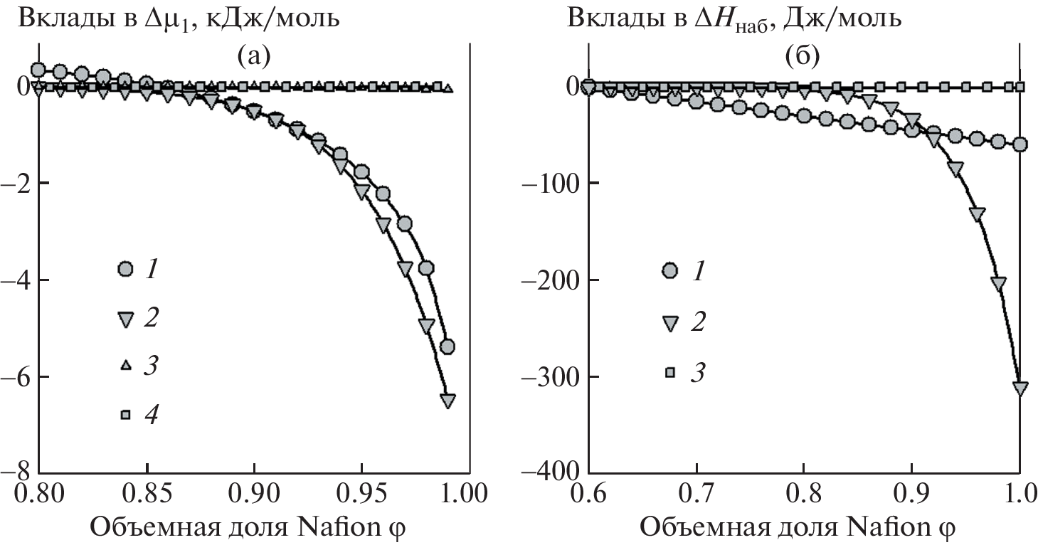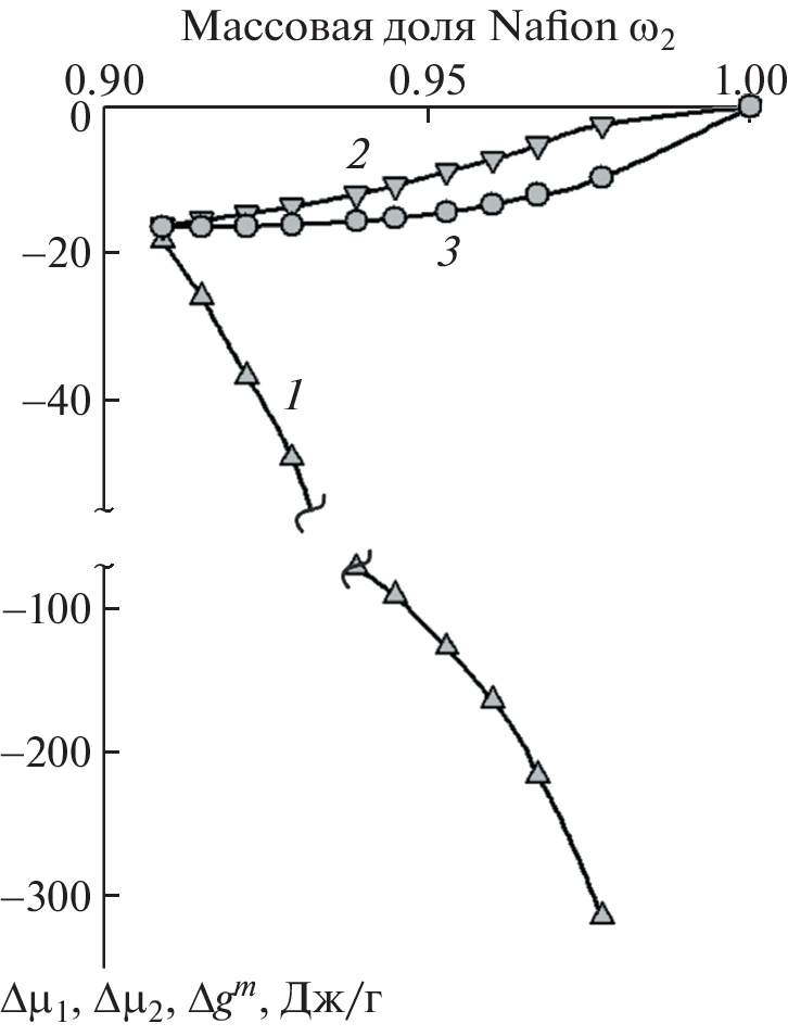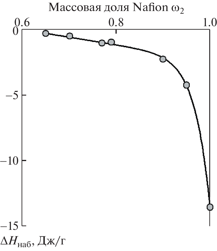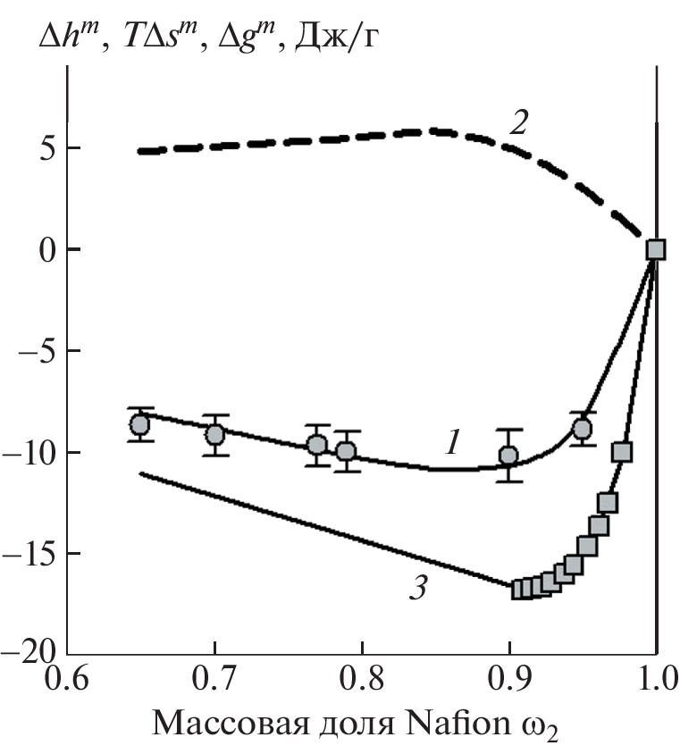 The thermodynamics of interaction between poly(perfluorosulfonic acid) Nafion and water is studied by isothermal sorption and microcalorimetry. The concentration dependences of energy and entropy parameters of mixing of Nafion aqueous solutions are determined. It is shown that the Gibbs energy and the enthalpy of mixing are negative while the entropy of mixing is positive over the entire range of solution compositions. The experimental water sorption isotherms and the concentration dependences of the enthalpy of dilution of aqueous solutions are analyzed in terms of the thermodynamic model allowing for pair nonvalence interactions in solution, nonequilibrium glassy structure of the polymer, and effects of the dissociation of ionic sulfo groups of Nafion. The calculated value of the Flory–Huggins parameter is 1.48, and the value of its enthalpy component is close to zero.
