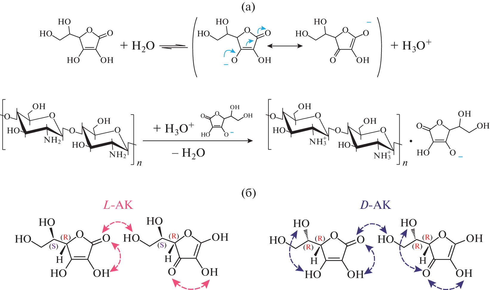 Using two samples of chitosan (D-glucan) with viscosity-average molecular mass 40 × 103 and 200 × 103 as the example, the influence of diastereomer form (L- and D-) of ascorbic acid on the energetics of formation, structure, and supramolecular ordering of hetero- (D‒L) and homochiral (D‒D) polymer–acid salt complexes has been studied. It has been found that heat effect during the interaction of chitosan with L-ascorbic acid in aqueous medium and degree of protonation of the (D‒L)-salts are lower in comparison with D-isomer of the acid. The homochiral (D‒D)-salts, in contrast to the heterochiral (D‒L)-salts, have exhibited lower amount of crystallization water, high degree of crystallinity, and denser supramolecular structure with high level of inter- and intramolecular contacts.