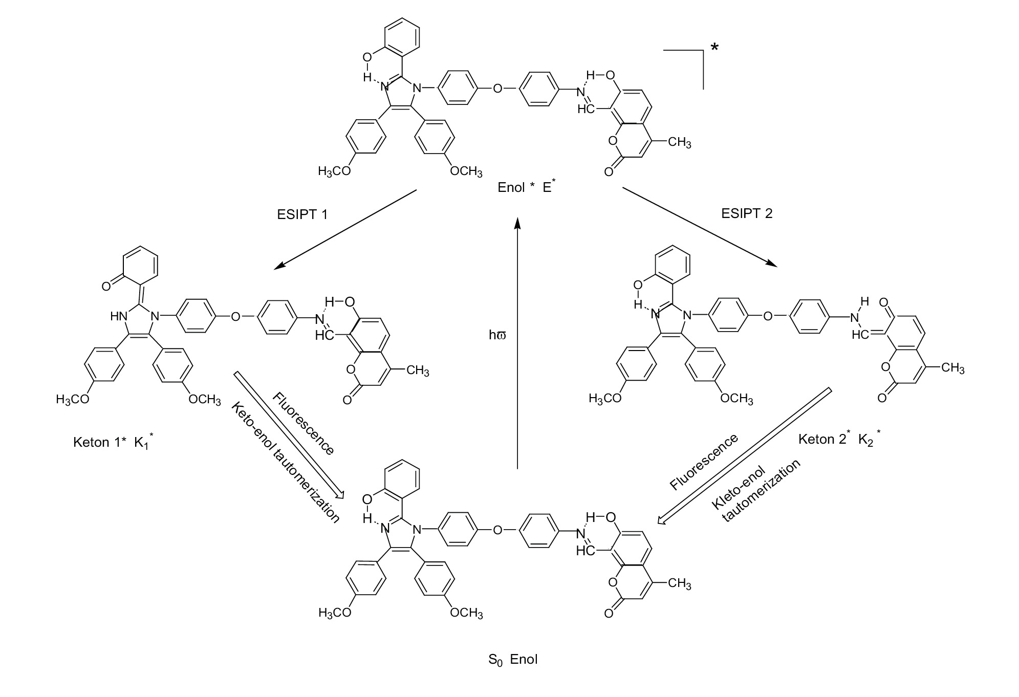 В каждом из представленных люминесцирующих фрагментов диады I может протекать внутримолекулярный перенос протона в возбужденном состоянии (ВППВС), приводя к появлению двух эмиссий – синей с максимумом при 430–450 нм и зеленой с максимумом при 530 нм, соотношение между которыми зависит от природы растворителя и длины волны возбуждающего света [8] (см. схему 2).