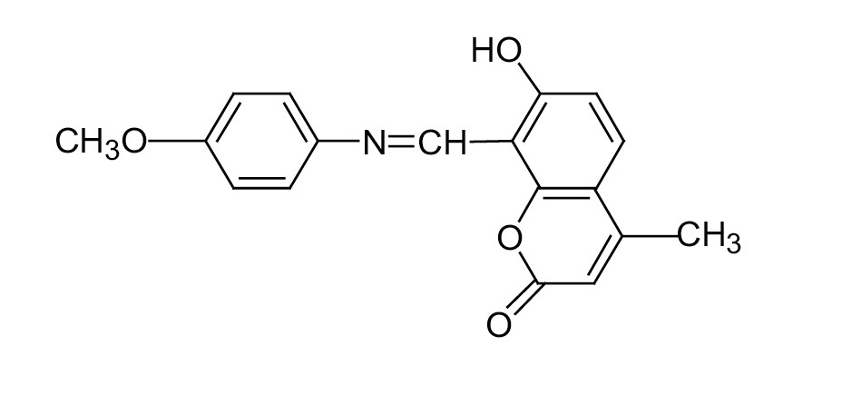 Поведение диады особенно отличается в растворе этанола: при возбуждении светом 330 нм прослеживаются уже три пика люминесценциис максимумами при 390, 445 и 530 нм. При возбуждении светом длиной волны 375 нм наблюдаются две эмиссии (445 и 530 нм), а при возбуждении светом длиной волны 460 нм – одна с максимумом при 530 нм. Для установления природы этих эмиссий были исследованы спектрально-люминесцентные свойства модели II, соответствующей азометинокумариновому фрагменту диады [8] (см. схему 3).