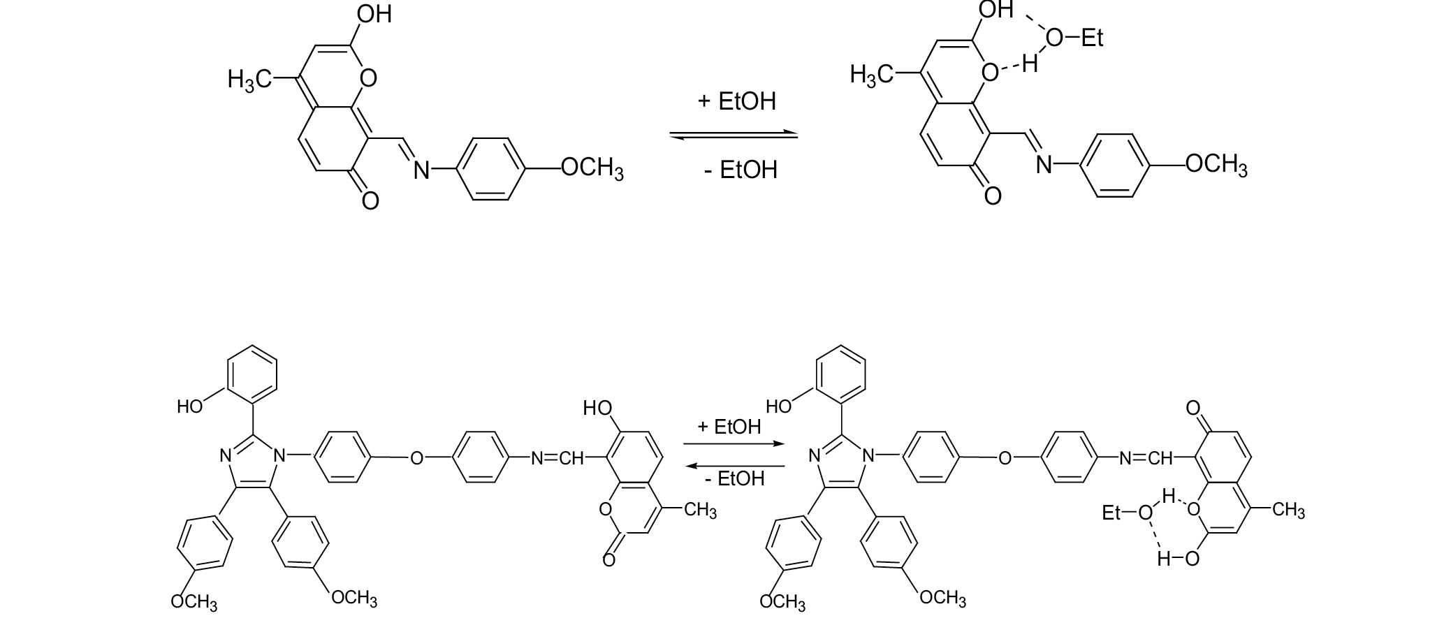 В CH2Cl2 наблюдается одна полоса люминесценции соединения II с максимумом 535 нм, обусловленная ВППВС протона гидроксильной группы на атом N связи C=N. В этаноле присутствуют несколько полос эмиссии, их соотношение зависит от длины волны возбуждения: при возбуждении 330 нм – три полосы (390, 440 и 530 нм), при возбуждении 375 нм – две (440 и 530 нм) и при возбуждении 460 нм – одна с максимумом 530 нм. Полоса люминесценции с максимумом при 390 нм – это люминесценция енольной формы кумаринового фрагмента с максимумом при 440 нм – люминесценция ассоциата кумарина со спиртом или аниона, с максимумом при 530 нм – люминесценция, возникшая в результате ВППВС [9]. Предполагаемые структуры ассоциатов азометинокумарина и диады с этанолом (см. схему 5).