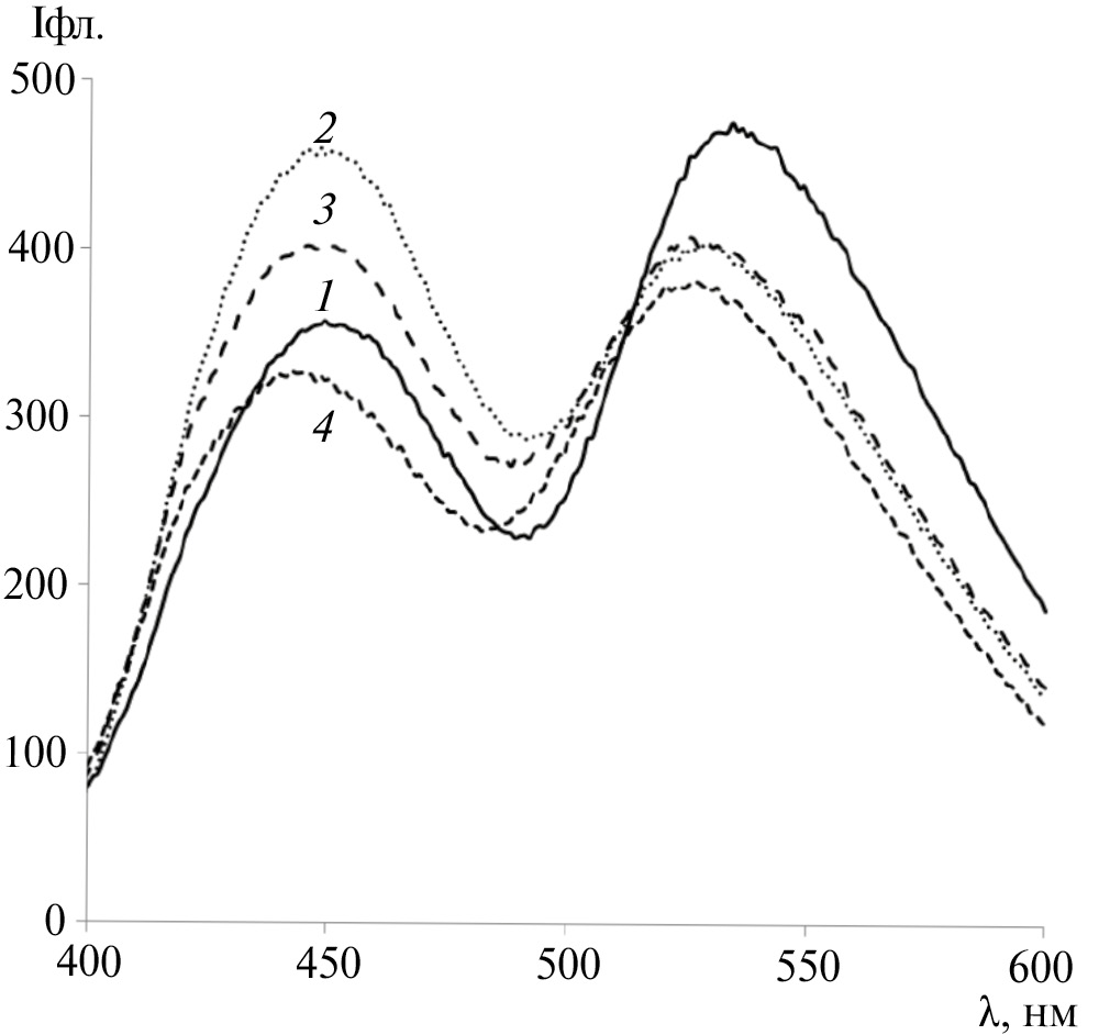 Рис. 1. Спектры люминесценции диады I в полимерных пленках МОК (1), МЭГ/МОК-4 (2), МЭГ/МОК-7 (3) и МЭГ (4) при разных значениях концентрации ОН-групп при λex = 350 нм. [OH] = 0 (1), 4.9 (2), 7.0 (3) и 13.0% (4)