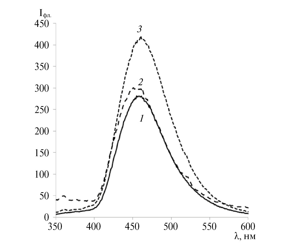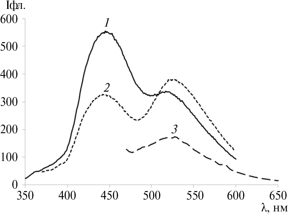 Рис. 2. Спектры люминесценции диады I в пленке МЭГ при длине волн возбуждения 330 (1), 350 (2) и 430 нм (3)