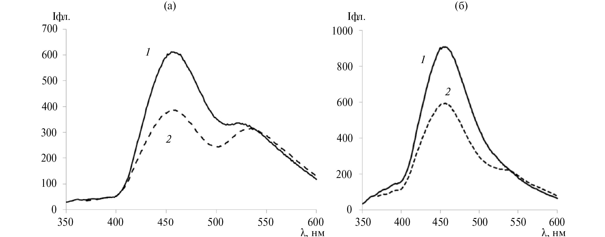 Рис. 4. Спектры флуоресценции диады в сетчатом полимере ТГМ-3 (а) и MB (б) при возбуждении светом 330 (1) и 350 нм (2)