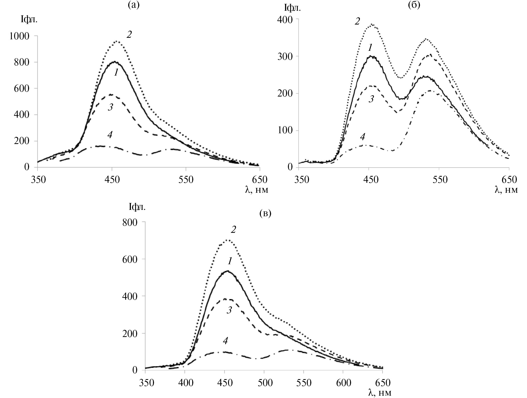Рис. 5. Спектры люминесценции диады в полимерной пленке, полученной фотоотверждением OКM-1 (а), OКM-2 (б) и OКM-2/1 (в) при λex = 330 (1), 340 (2), 350 (3) и 360 нм (4)