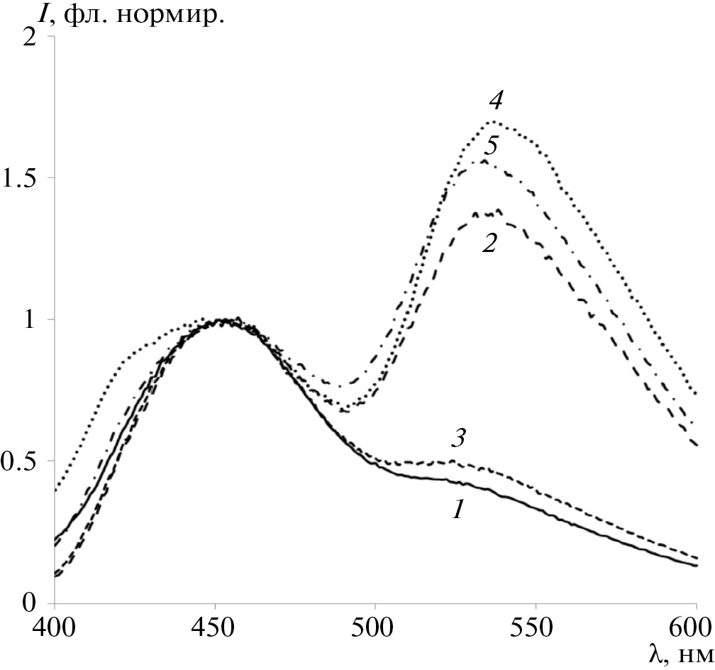 Рис. 6. Спектры люминесценции диады в полимерных пленках, полученных фотоотверждением ОКМ-1 (1), ОКМ-2 (2), ОКМ-2/1 (3), ОКМ-5 (4) и ОКМ-7 (5) при λex = 350 нм