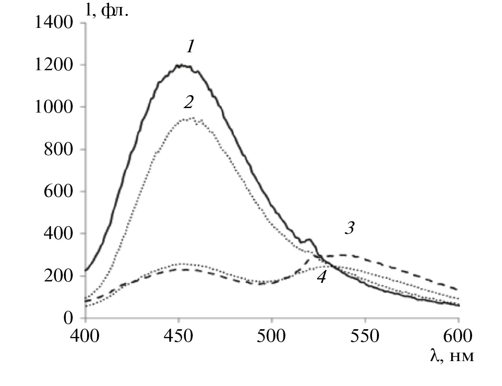 Рис. 7. Спектры флуоресценции диады в ФГА (1), ФЭА (2), ОКМ-5 (3) и ОКМ-7 (4) при λex = 330 нм