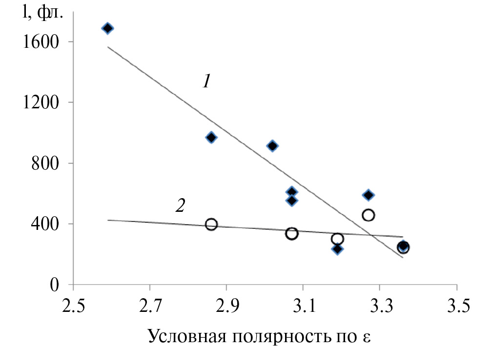 Рис. 8. Зависимость интенсивности люминесценции диады от условной полярности полимерных матриц при возбуждении светом длиной волны 330 нм; λфл = 450 (1) и 530 нм (2)