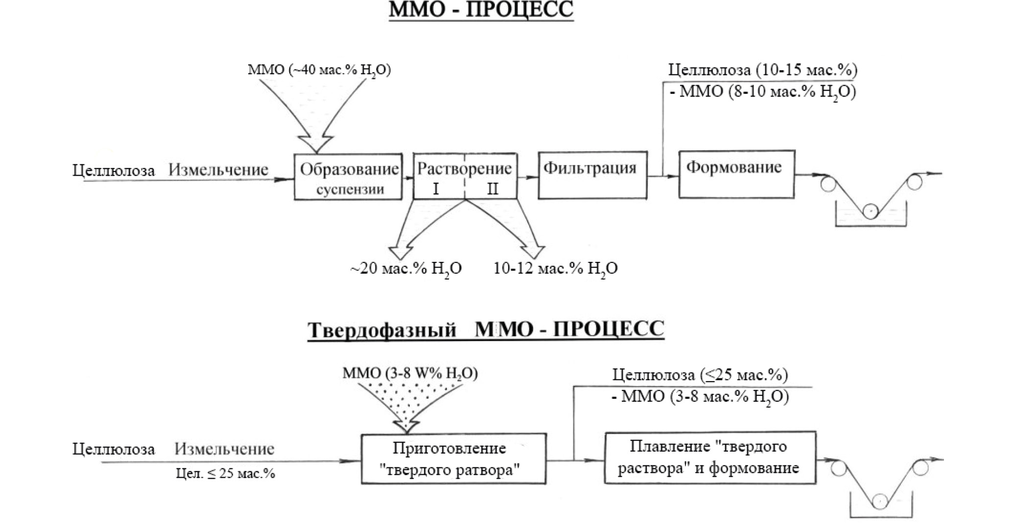 Наиболее широко используется моногидратная форма ММО, сочетающая достаточно высокую растворяющую способность со сравнительно низкой температурой плавления. В моногидрате ММО можно получить растворы, содержащие до 15% целлюлозы. Дальнейшее уменьшение содержания воды в ММО приводит к повышению растворяющей способности и сопровождается увеличением температуры плавления вплоть до безводного ММО (Тпл. ангидрида ММО равна 182°C). Однако реализовать высокую реакционную активность безводного ММО не представляется возможным ввиду близости температуры плавления к температуре активной термической деструкции.