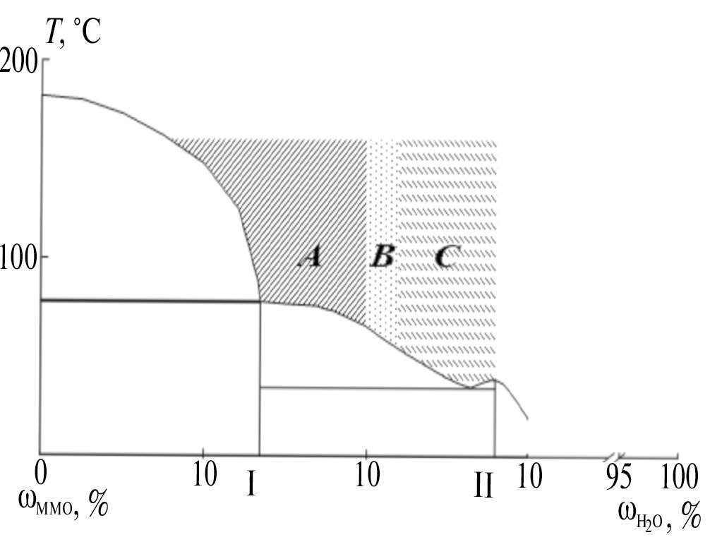 Высокую эффективность взаимодействия ММО с группами ОН целлюлозы обеспечивает наличие в молекуле ММО семиполярной донорной связи N→О с двумя неподеленными электронными парами на атоме кислорода, способными взаимодействовать с двумя протонсодержащими группами. ММО существует в трех термодинамически равновесных кристаллогидратных формах [17, 18]. На рис. 1 представлена двухкомпонентная диаграмма системы ММО–Н2О с тремя термодинамически равновесными кристаллогидратными формами ММО: 2,5-гидратная форма (II), содержащая 28% воды и имеющая Тпл = 38°C, способна вызывать только набухание целлюлозы, моногидратная ( I) c содержанием воды 13.3% и Тпл. = 76°C (МГ ММО) и безводная с Тпл. ~182°C.