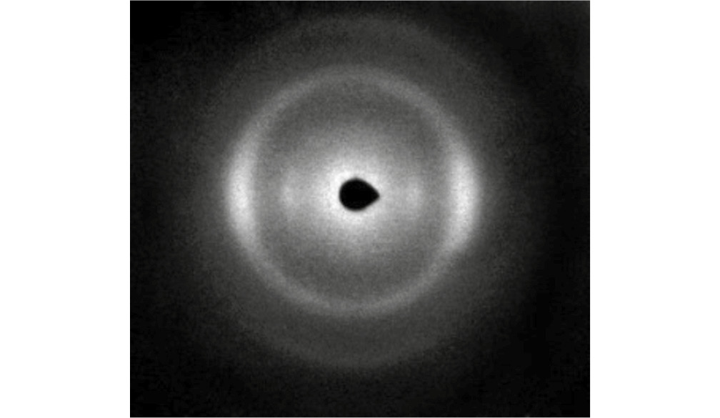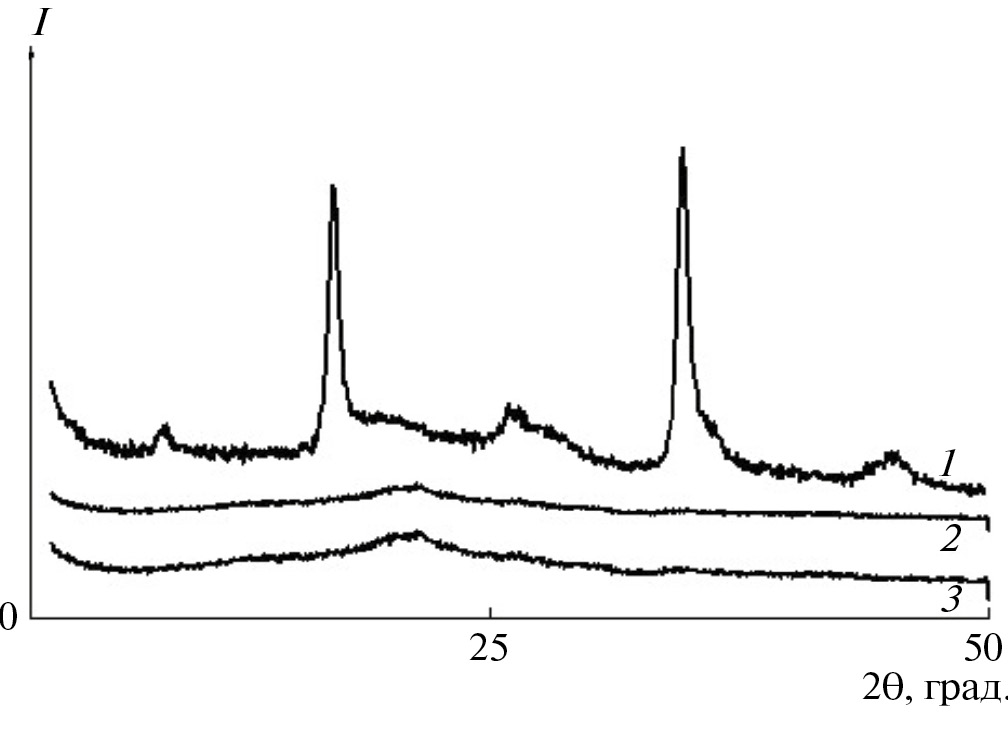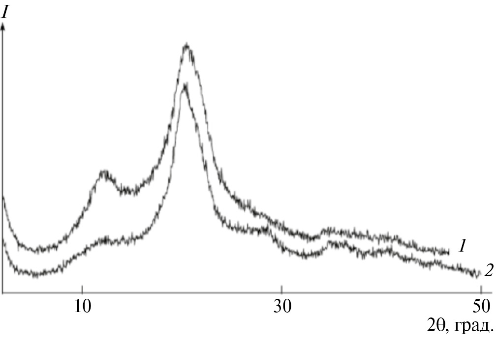 Кривые распределения интенсивности на меридиональной и экваториальной дифрактограммах полученного гель-волокна практически совпадают, рентгенограммы имеют диффузный характер (рис. 3).