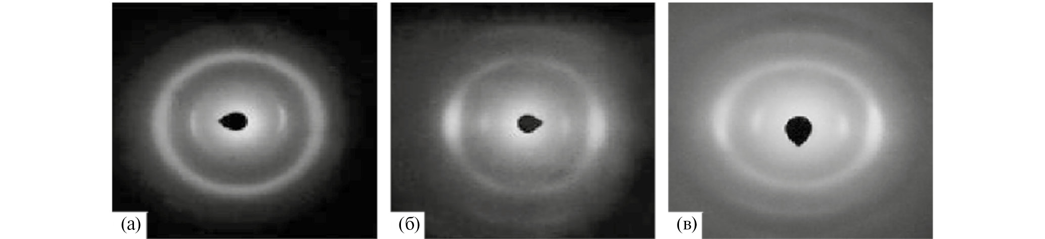 Рис. 8. Фоторентгенограммы смесевых волоконных образцов, состоящих из 95% целлюлозы и 5% ПМФИА, при степени вытяжки λ = 6 (а), 13 (б) и 16 (в).