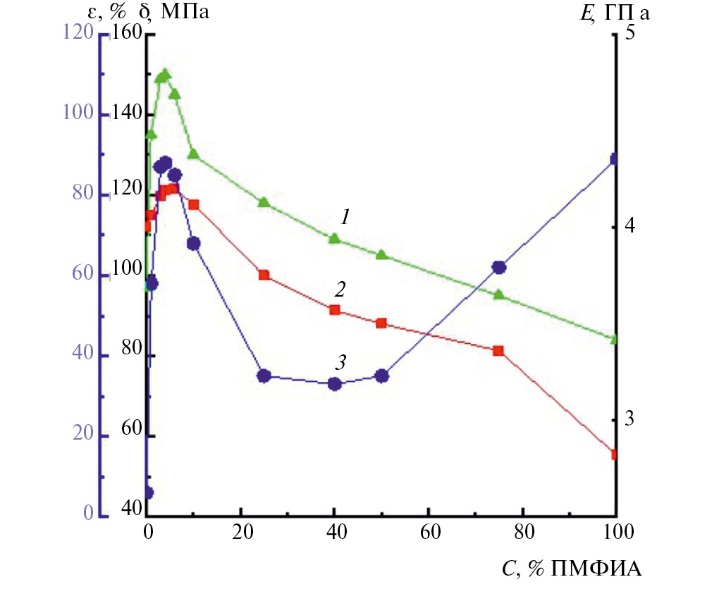 Как видно на рис. 10, максимальные значения разрывного удлинения ε, прочности σ и модуля Ε наблюдаются для композиции, содержащей до 5% ПМФИА, т. е. в области существования системы в мезофазном состоянии. Причем, если прочность и модуль возрастают на 10–30%, разрывное удлинение увеличивается фактически в 3 раза и достигает 150%.