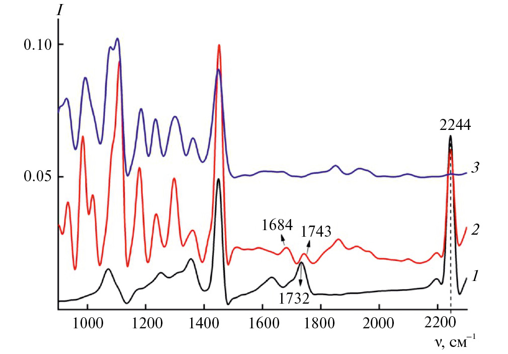 Между тем, наряду с новой полосой 1683 см–1 в спектре волокон 2 появляется еще одна полоса 1575 см–1, они достаточно хорошо соотносятся с полосами Амид I и Амид II в первичных амидах [59]. Данные изменения вследствие перехода от спектра образца 1 к спектру образца 2 могут быть объяснены протеканием во время термостатирования эмульсии, одновременно с формированием новых водородных связей, и реакции гидролиза ограниченного числа нитрильных групп в ПАН–МС с образованием амидных групп: