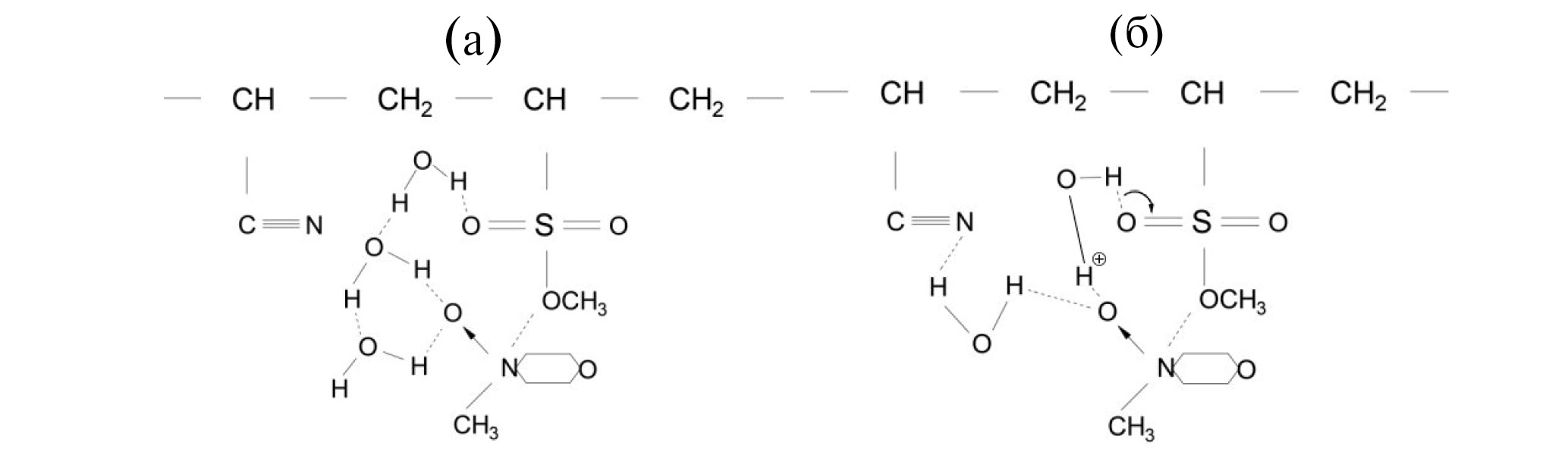 Первый вид комплекса можно объяснить образованием водородных связей между отрицательным атомом кислорода N→O молекулы МГ ММО и протоном карбоксилатной группы сополимера, что приводит к сдвигу электронной плотности от связи С=О, сопровождаемому смещением полосы 1732 см–1 в ИК-спектре в длинноволновую область до 1684 см–1. При этом кислородный атом карбонильной группы может взаимодействовать с протоном при третичном углеродном атоме основной цепи ПАН–АК.