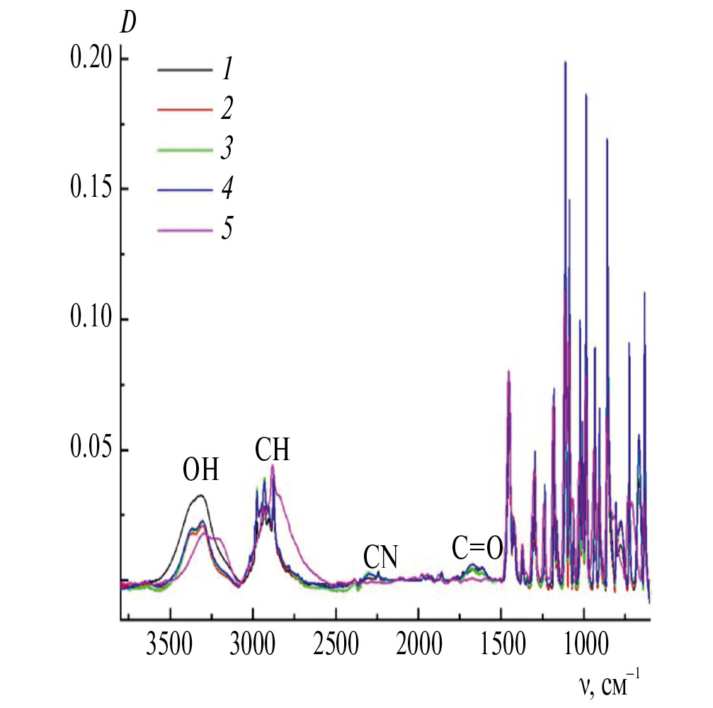 Особенности взаимодействий между целлюлозой, ПАН–АК и ММО в сформованных волокнах в зависимости от количества, вводимого ПАН–АК, исследована с помощью ИК-спектроскопии.