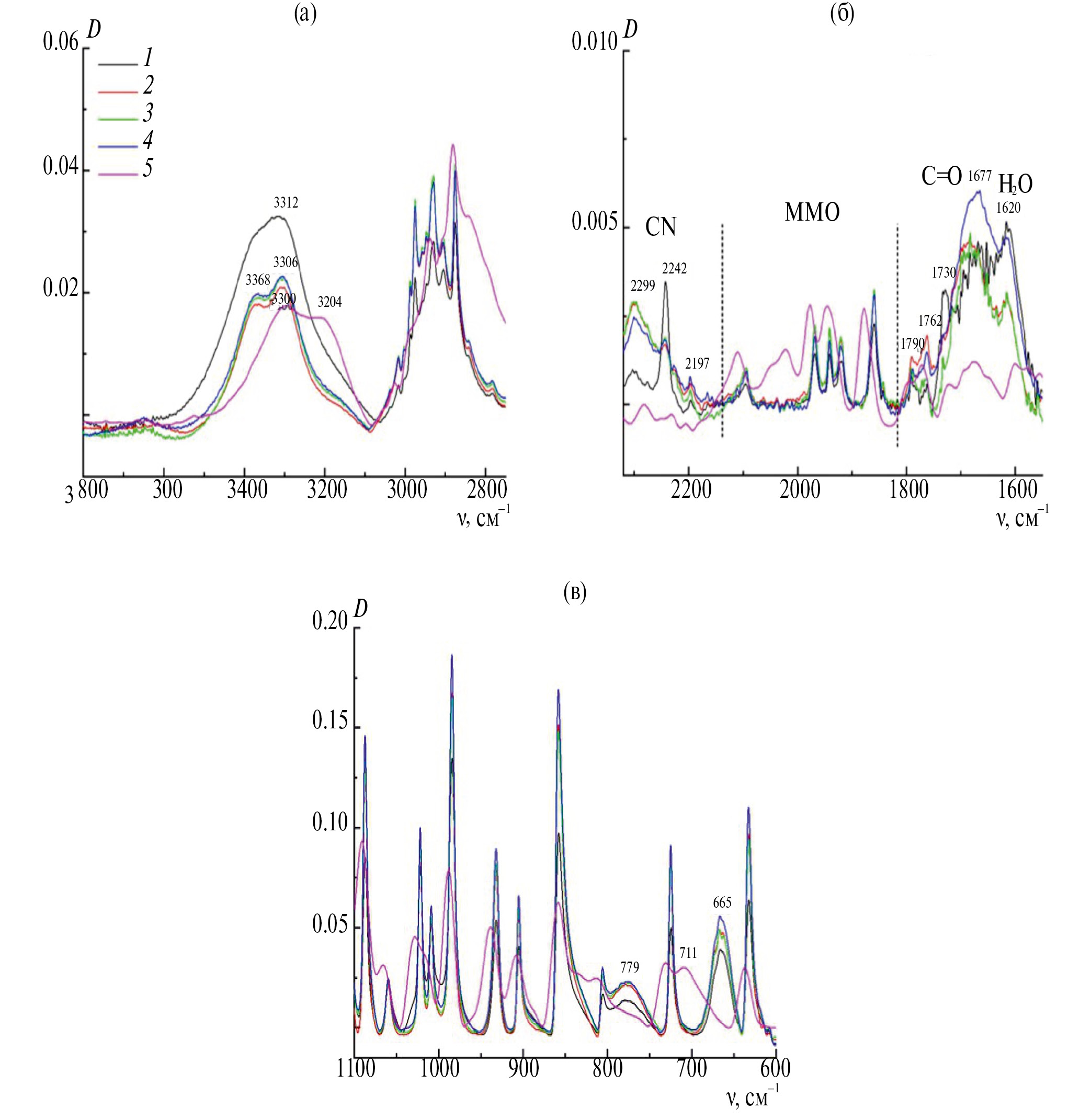 Рис. 17. Сравнение ИК-спектров смесевых волокон 60% ПАН–МС–40% целлюлозы, сформованных при 120°С из 18%-ных растворов сразу после перехода в вязкотекучее состояние (1), после термостатирования в течение 30 мин при 120°С и ПАН–МС (3) в области валентных колебаний ОН, СН и ‒C≡N-групп (а) и в области валентных колебаний С=О и С–О (б).