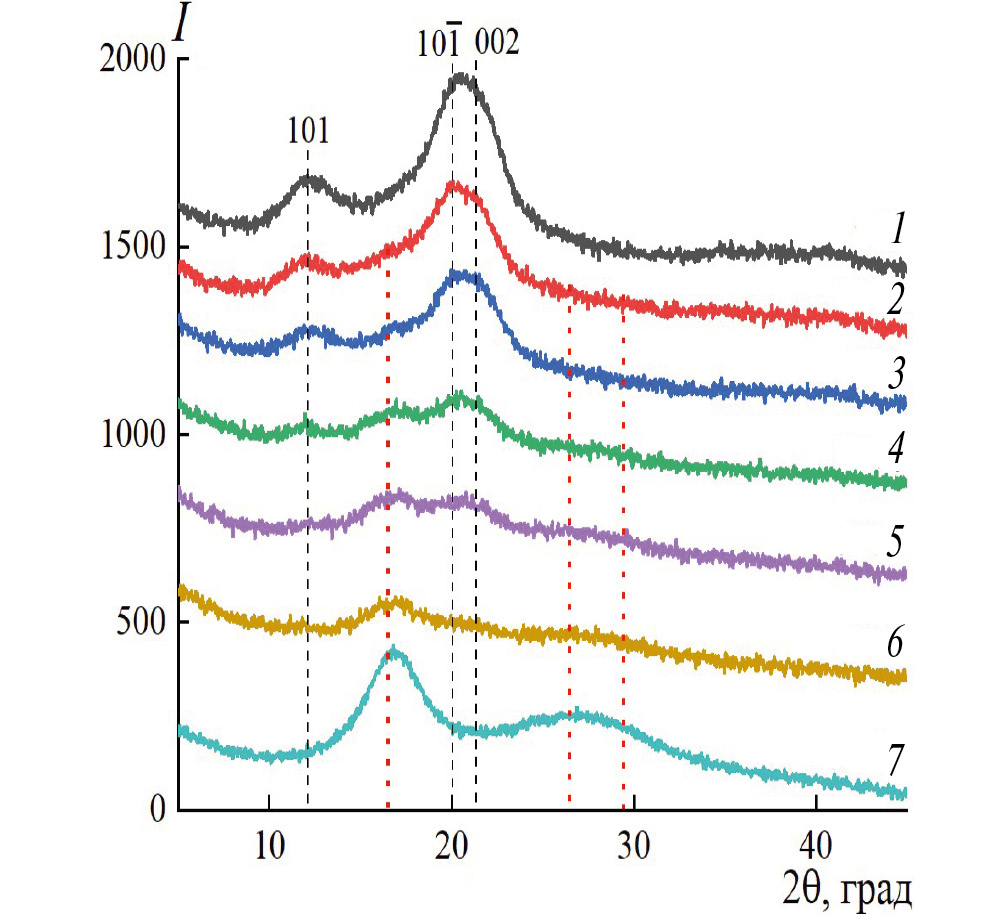 Рис. 18. Экваториальные дифрактограммы композиционных волокон, сформованных из 18%-ных смесевых растворов с содержанием ПАН 0 (1), 30 (2), 40 (3), 60 (4), 70 (5), 90 (6) и 100% (7).